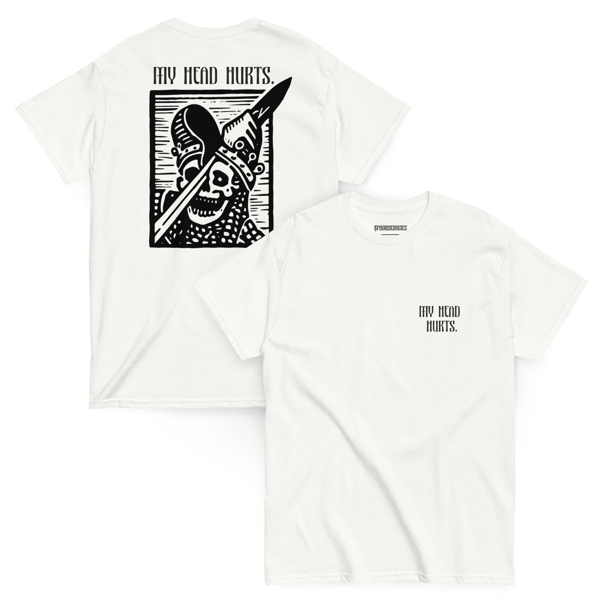 Featuring a lino-cut, graphic-style skull being cleaved, it captures what it actually feels like when your nervous system taps out and your brain decides reality is optional for the day, because migraines are not subtle, and neither is surviving them.